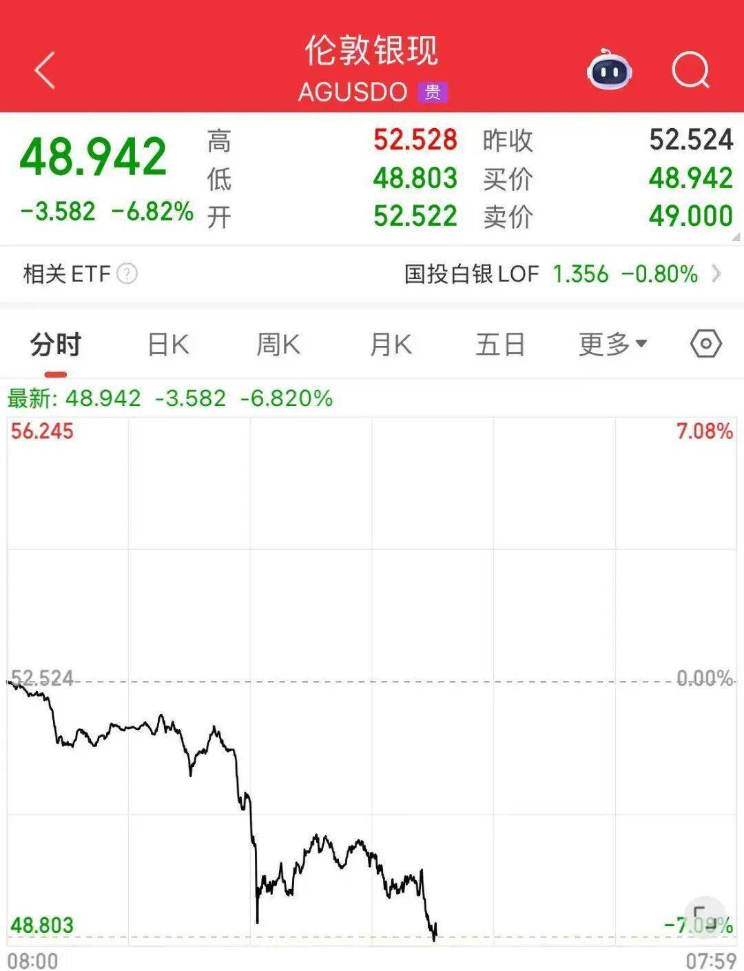 现货白银一度跌至48.803美元/盎司,下跌幅度达到7.08%。