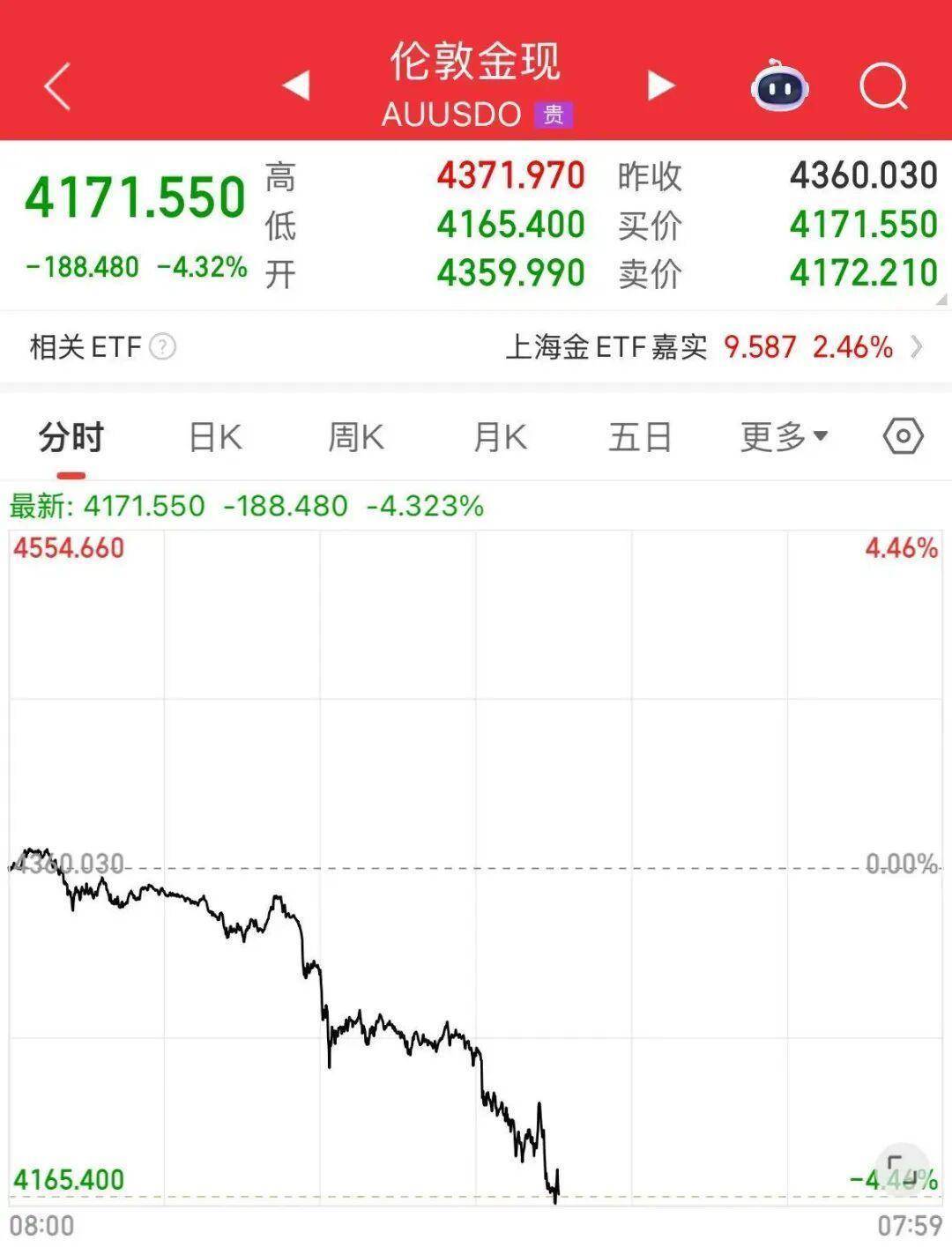 10月21日,国际金银突然直线跳水。现货黄金一度下跌至4165.400美元,一度下跌4.46%,创四年来最大跌幅。
